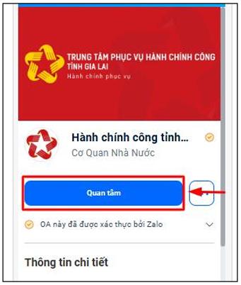 - Bước 2: Sau khi trang Zalo OA hiện ra, bạn nhấn nút "Quan tâm" màu xanh dương.