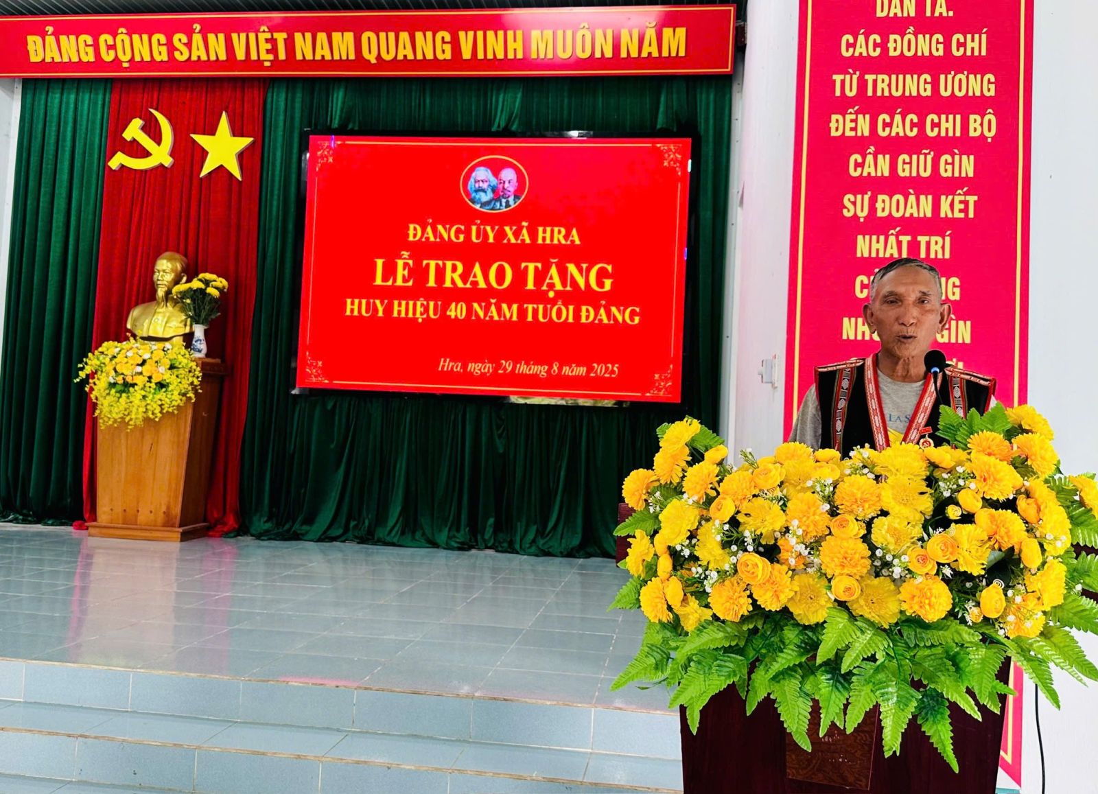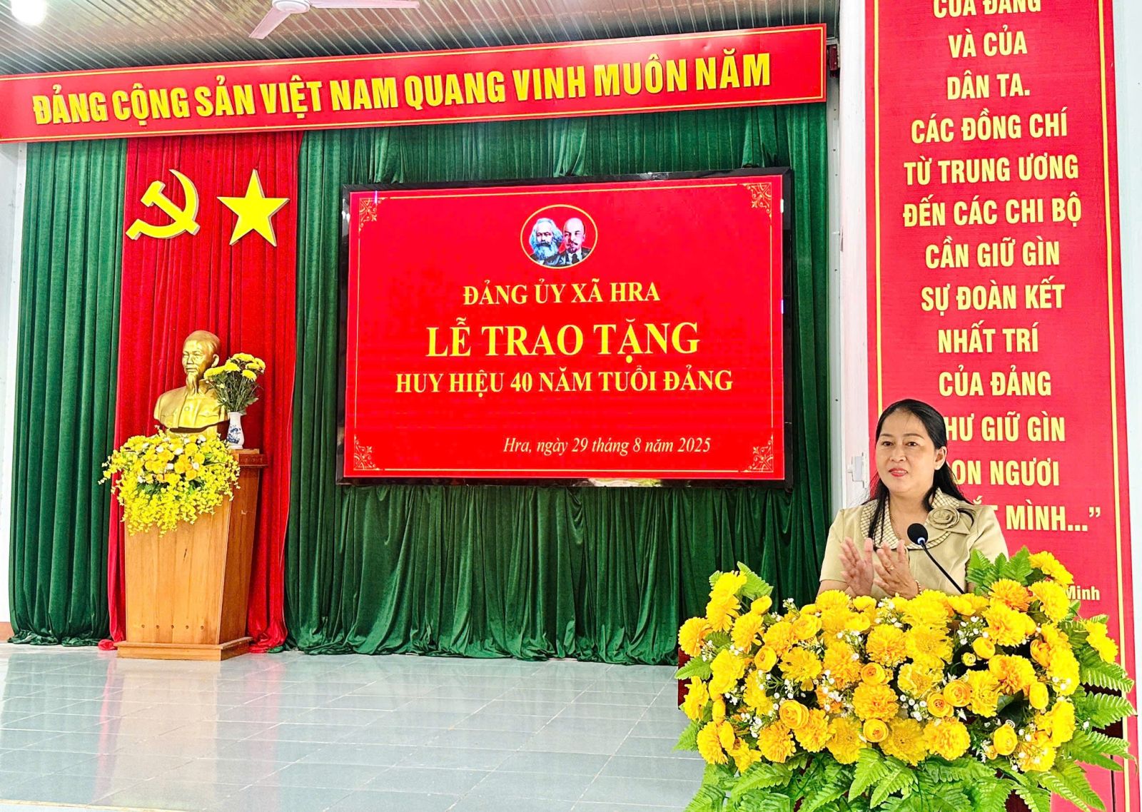 Phát biểu chúc mừng, đồng chí Đinh Thị Minh Hà đã ghi nhận và biểu dương những cống hiến to lớn của các đồng chí đảng viên trong suốt chặng đường phấn đấu, rèn luyện cho sự nghiệp cách mạng của Đảng và dân tộc. Đồng chí nhấn mạnh, việc trao tặng Huy hiệu Đảng là sự ghi nhận của Đảng đối với quá trình công tác và những đóng góp của mỗi đảng viên, đây không chỉ là vinh dự của cá nhân mà còn là niềm tự hào chung của gia đình, chi bộ và toàn Đảng bộ xã Hra.