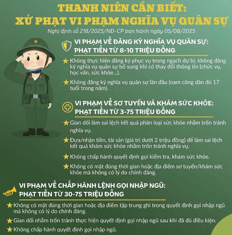 1. Vi phạm về Đăng ký Nghĩa vụ quân sự: Phạt từ 8 - 10 triệu đồng
