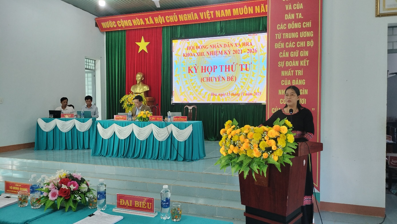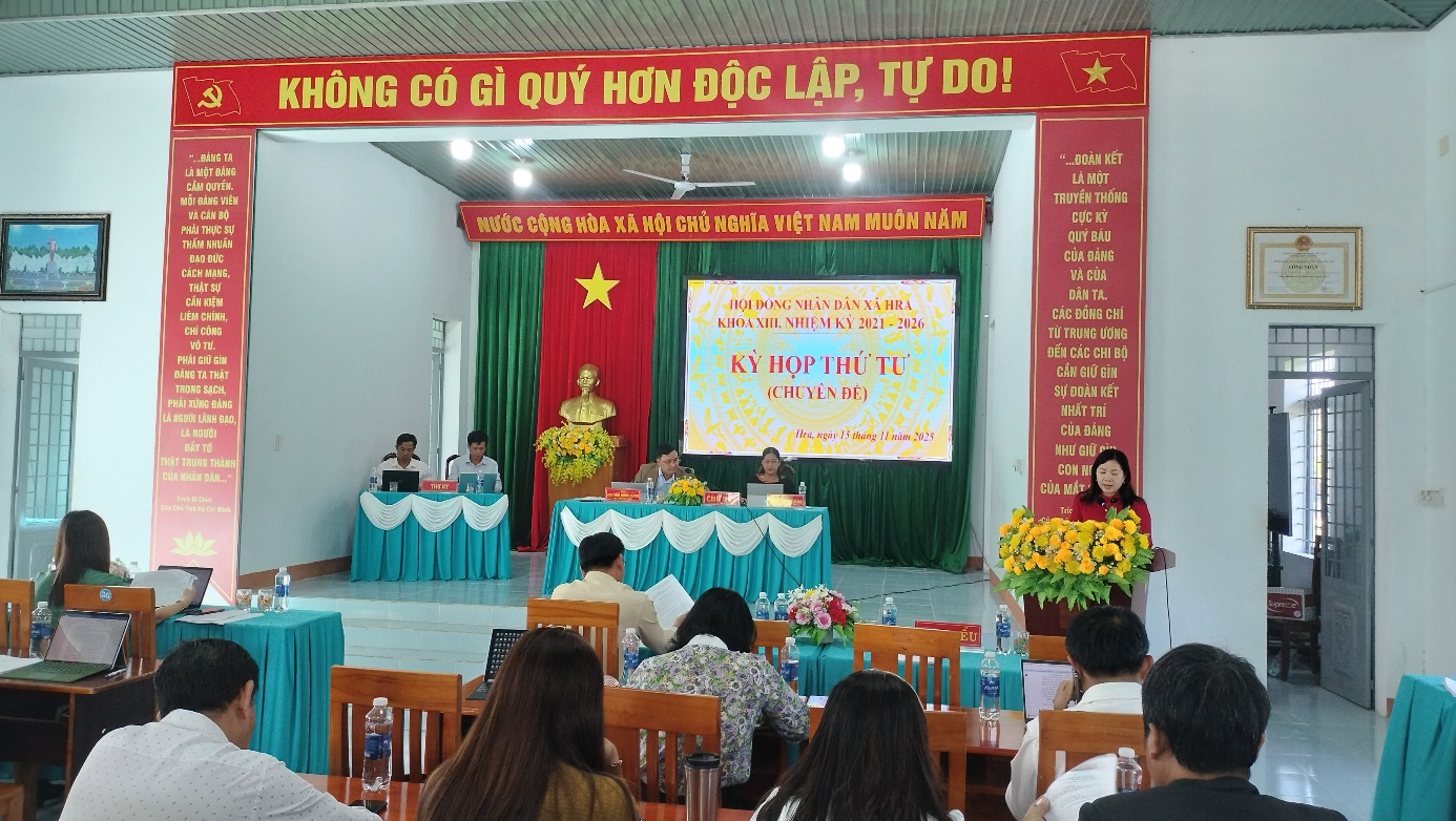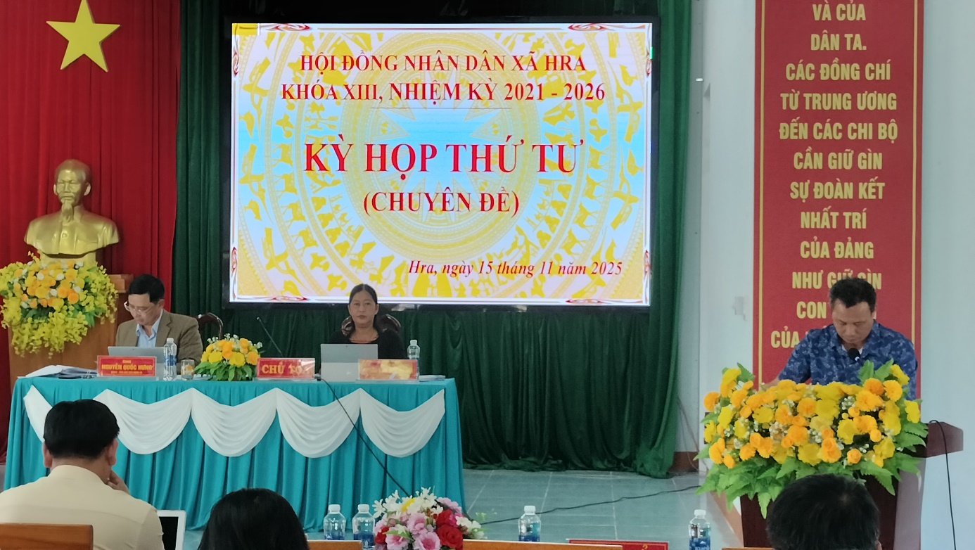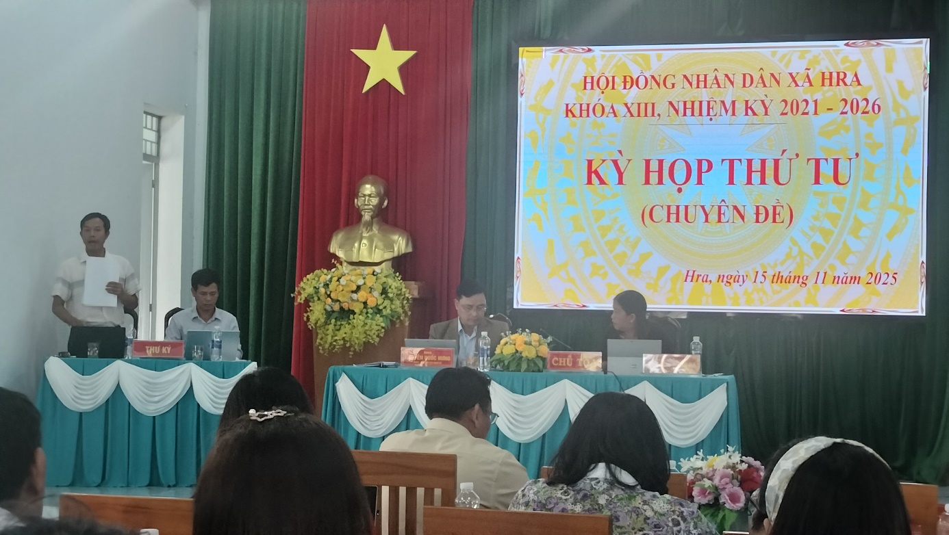 Chiều ngày 15/11/2025, tại Hội trường UBND xã Hra, Kỳ họp thứ 4, Hội đồng nhân dân xã khóa XIII đã được tổ chức thành công với tinh thần nghiêm túc, dân chủ và trách nhiệm. Đây là kỳ họp quan trọng nhằm xem xét, thảo luận và quyết nghị nhiều nội dung liên quan trực tiếp đến phát triển kinh tế – xã hội và đời sống Nhân dân trong năm 2025.