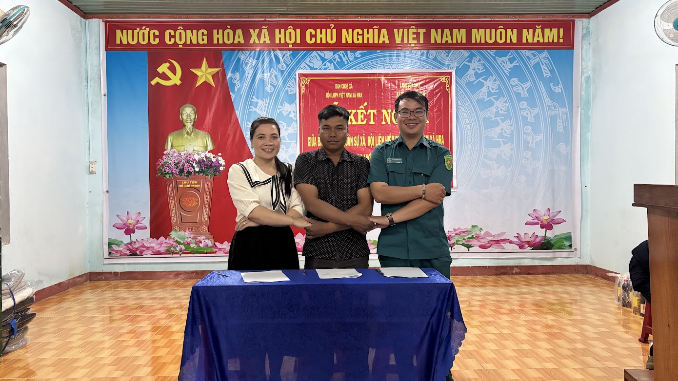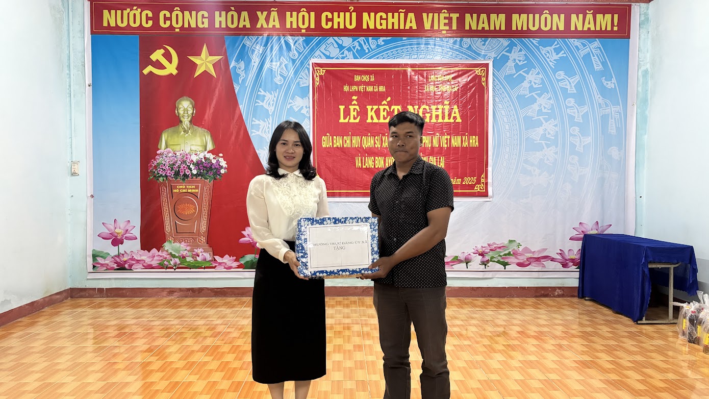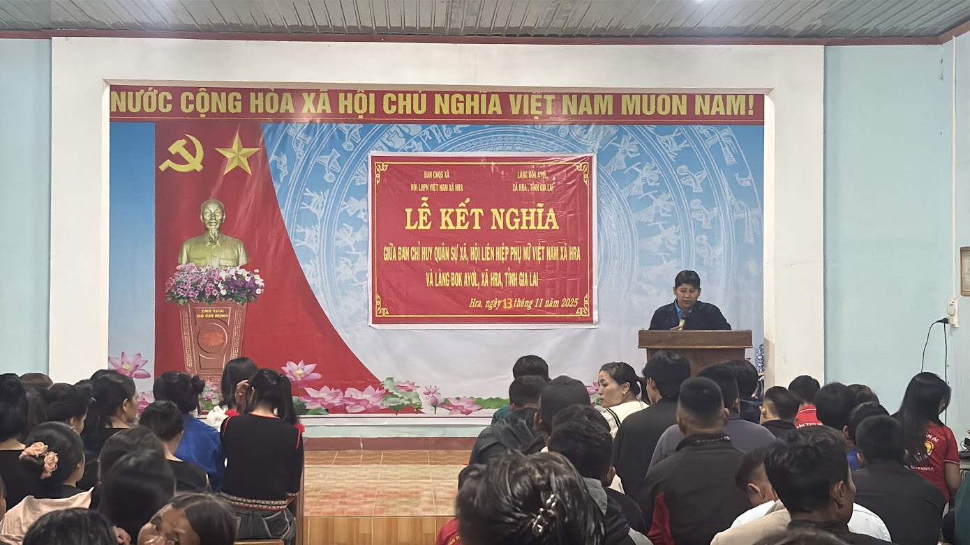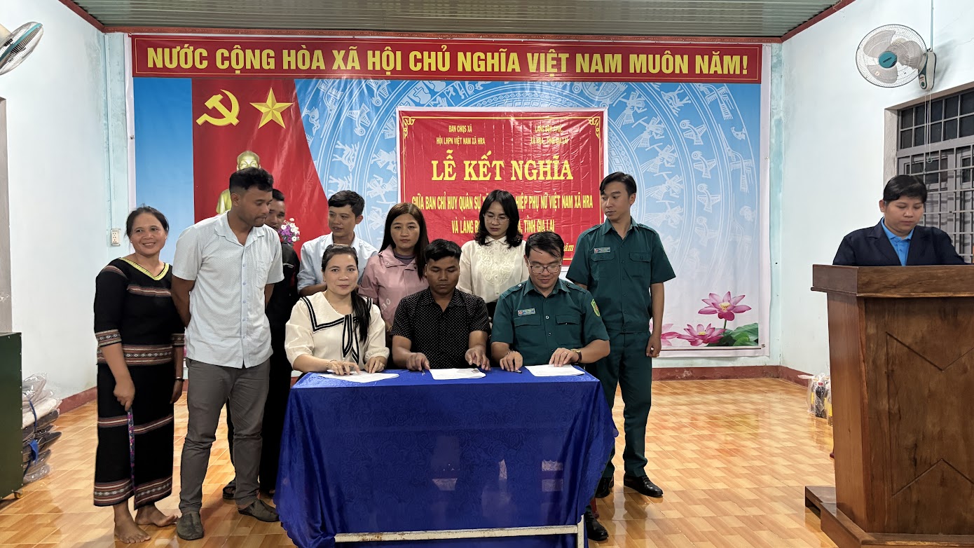 Trên tinh thần đoàn kết, thấu hiểu và chia sẻ, đại diện ba đơn vị: BCHQS xã, Hội LHPN xã Hra và Làng Bok AYơl đã cùng nhau ký kết biên bản kết nghĩa. Nội dung ký kết tập trung vào việc tăng cường phối hợp tuyên truyền, vận động nhân dân chấp hành chủ trương, đường lối của Đảng, chính sách, pháp luật của Nhà nước; giữ gìn an ninh chính trị, trật tự an toàn xã hội tại địa phương.