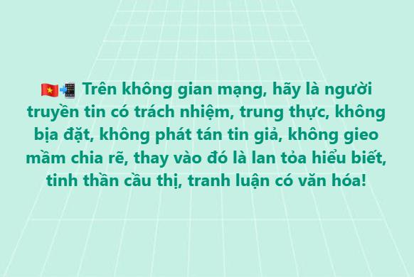 "Trên không gian mạng, hãy là người truyền tin có trách nhiệm, trung thực, không bịa đặt, không phát tán tin giả, không gieo mầm chia rẽ, thay vào đó là lan toả hiểu biết, tinh thần cầu thị, tranh luận có văn hoá!"